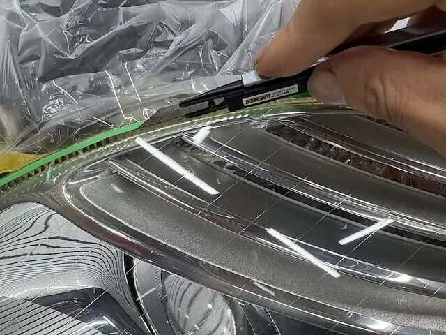 切れ目が浅すぎるとフィルムがカットできませんし、深すぎるとヘッドライトにカッター傷が入ってしまいますので、とても慎重におこなわなければいけません。